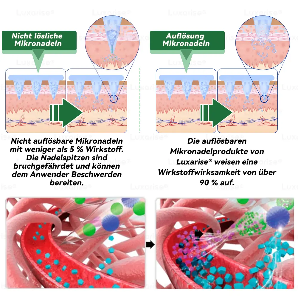 Unser Nano-Mikronadelpflaster ist dermatologisch getestet und prรคzise entwickelt, um die transdermale Freisetzung von Wirkstoffen zu steuern.ย Die Haut bildet zwar von Natur aus eine starke Barriere, doch dieses fortschrittliche Nano-Mikronadelsystem ist speziell dafรผr konzipiert, diese Barriere sicher und effektiv zu durchdringen. Jede Mikronadel ist nurย 0,27 mm lang โ etwa ein Siebtel der Dicke eines menschlichen Haares โ und besteht aus resorbierbaren bioaktiven Materialienย . Dies gewรคhrleistet eineย sanfte, nahezu schmerzfreie Anwendungย und transportiert die Wirkstoffe direkt in die Haut.